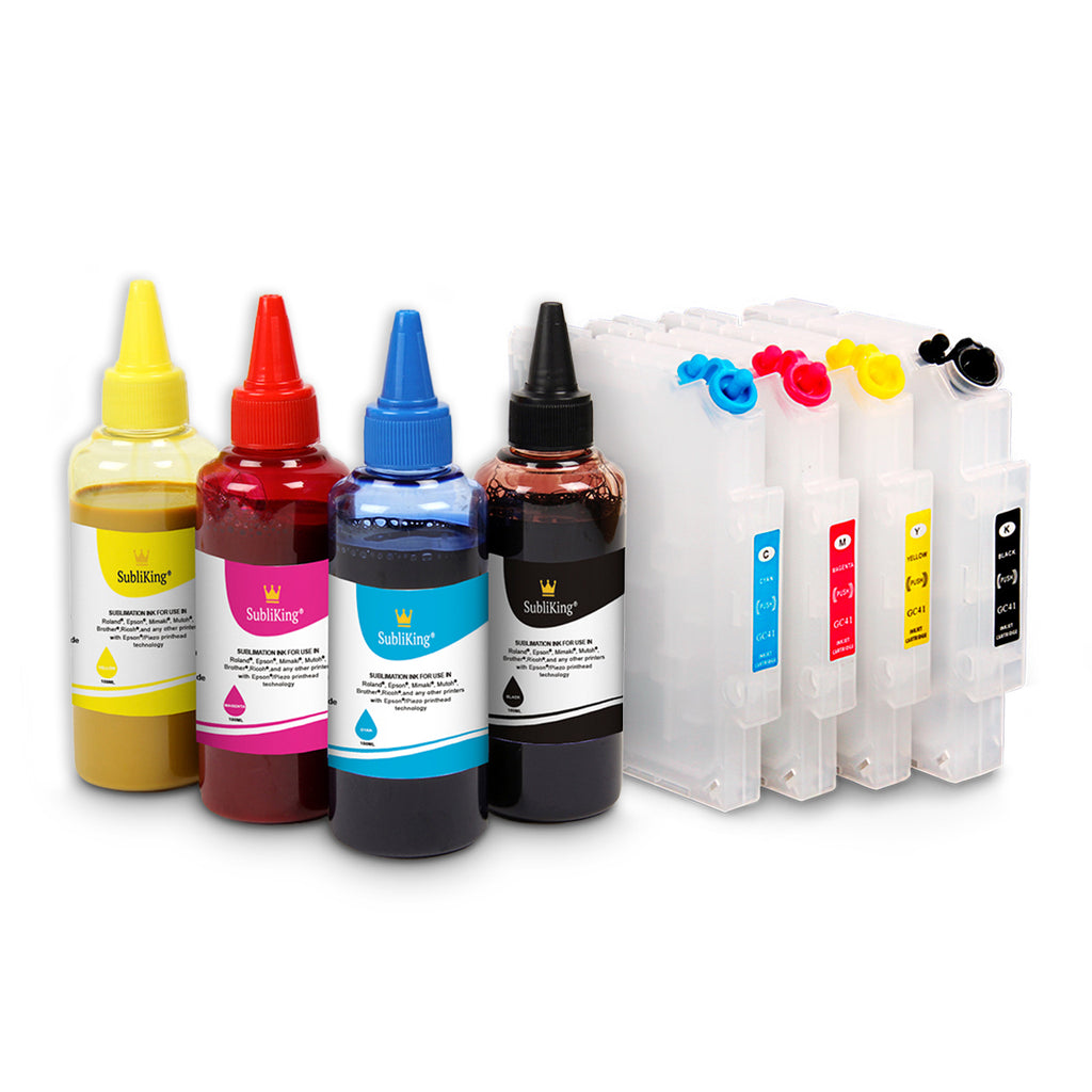 Erzielen Sie HIGH PERFORMANCE Druckergebnisse mit unseren hochwertigen SubliKing® Dye-Sublimationstinten. Dieses Set bietet professionelle Qualität, Umweltverträglichkeit und maximale Kostenersparnis für alle Ricoh®-Modelle, die GC-41 Kartuschen verwenden.
